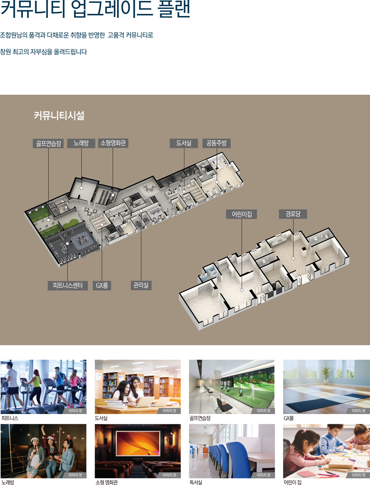 ※ 커뮤니티 내 이미지는 소비자의 이해를 돕기 위해 제작된 것으로 커뮤니티 내 세부시설 및 기기의 종류와 위치는 변경될 수 있으며 시설물의 수량과 바닥, 벽체 마감 등은 실제 시공과 상이할 수 있습니다.
